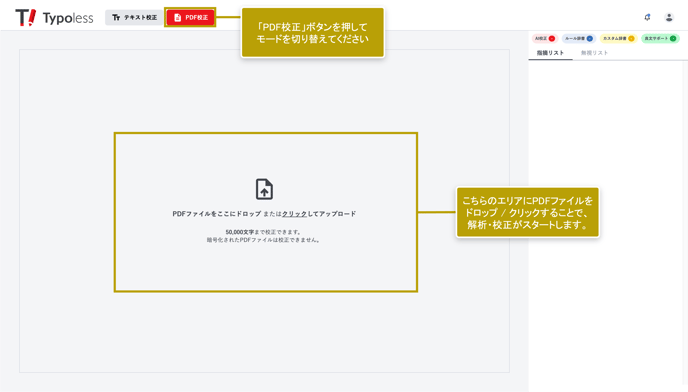 次に、画面中央のエリアにPDFファイルをドラッグ&ドロップするか、そのエリアをクリック→ファイルを選択してアップロードすることで、PDF校正を開始できます。50,000文字まで校正が可能です。