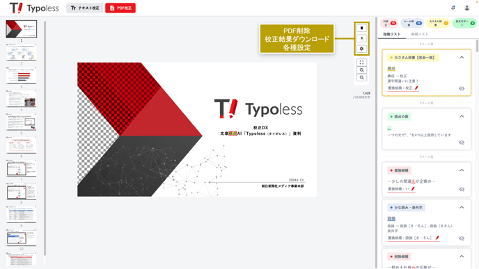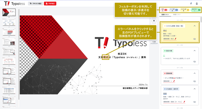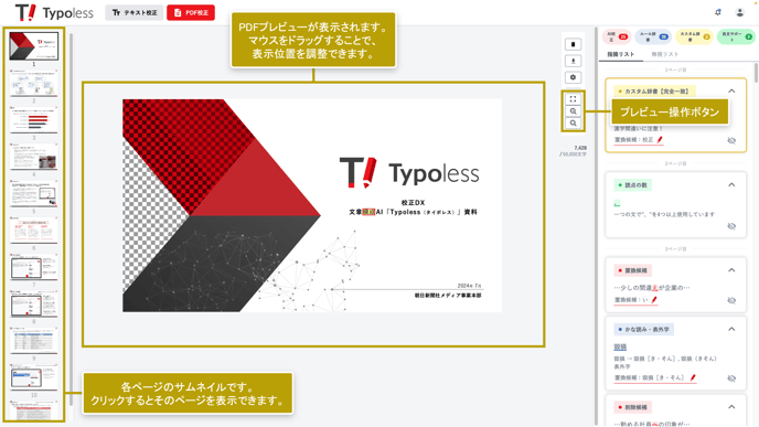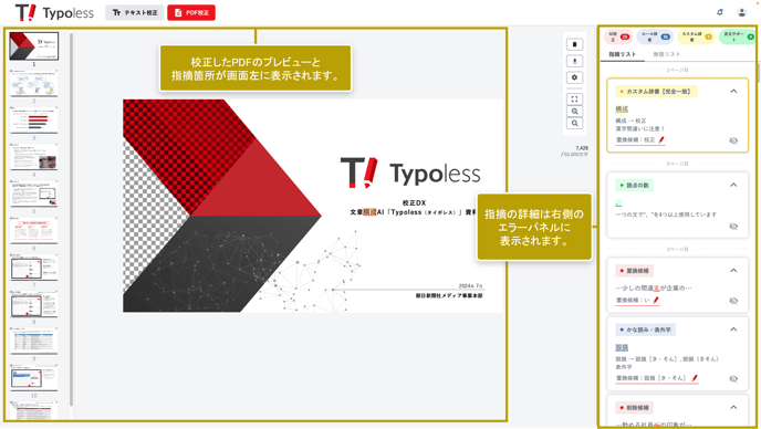 PDFファイルの解析・校正が完了すると、画面左側にPDFのプレビューと、校正の指摘箇所が表示されます。